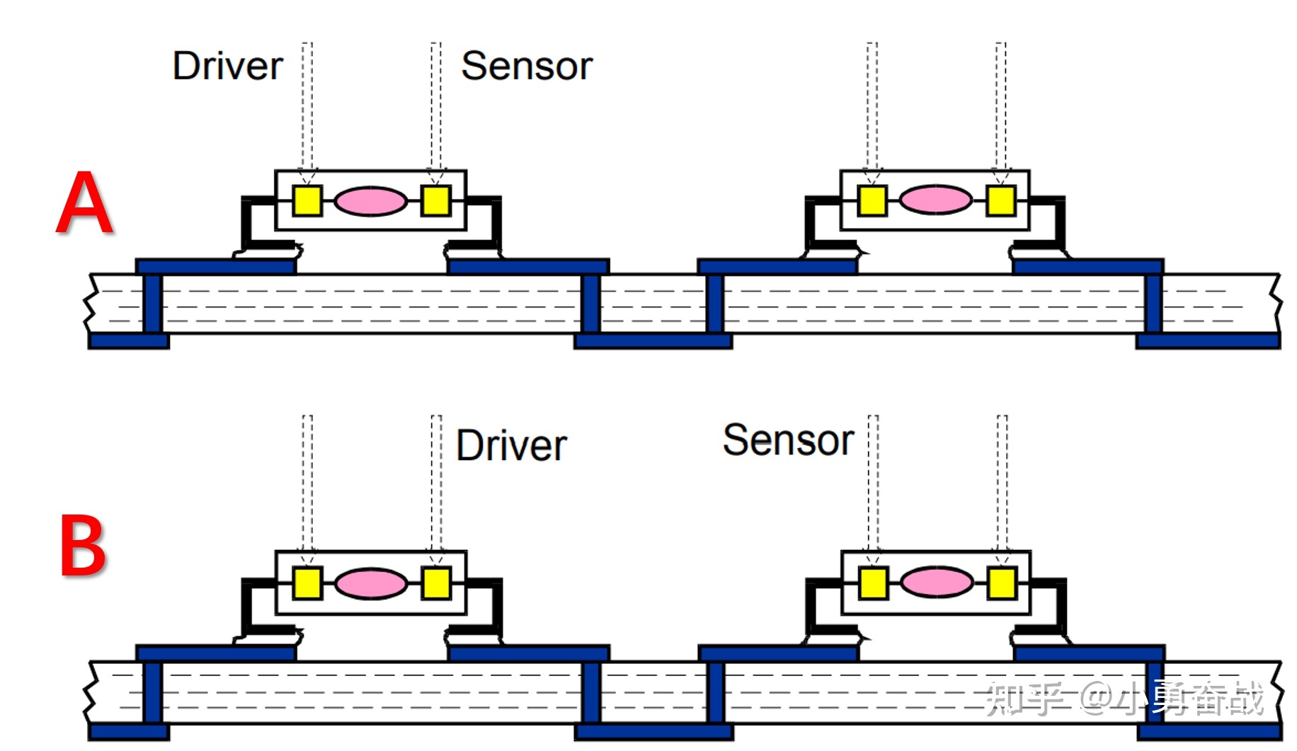 Jtag 作为一个国际化的标准,目前我们可以用它来做程序烧录,debug,电路检测等操作。在数字电路设计中,大多作为电路故障诊断的一种手段。图1展示了对电路功能的两种检测方案。现假设我们利用 verilog 实现了一个性能非常 nice 的加法器,吊打各大公司的 IP ,然后功能仿真也没有任何问题。但是我们并不确定加工生产(原谅我着拙劣的用词)出来的电路到底是个什么情况?哎,这个时候 jtag 就可以发挥作用了。在图1(A)中那个粉红色的单元就是我们写的超级 nice 的加法器,左右两侧的黄色单元是其与外部的引脚连线。我通过 jtag 在左侧灌入激励(Driver),然后从右侧查看与之对应的响应(Sensor),从而判断这个加法器的实际电路有没有缺陷。图1(B)呢大家可以思考一下,我们后面以这个为例做具体的讲解。
