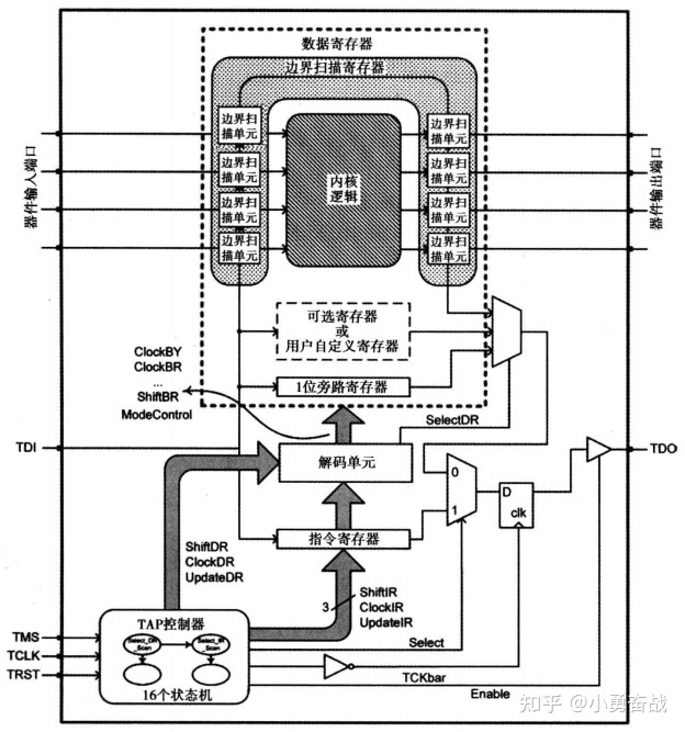 那啥叫移入芯片和移出芯片?我们前面举了一个加法器的例子。我们就是这么简单粗暴,完成了对一个加法器电路的流片。我们需要完成对加法器电路的检测。那现在这个加法器就是图2所示的内核逻辑。因此,TDI 的作用就是通过 TDI 端口将激励灌入这个内核逻辑,TDO 就是将反馈结果从内核逻辑中取出来,方便我们人为的观察和评判数据的正确性。那 TDI 和 TDO到底是怎么做到的呢?别急,这部分内容有点杂,劳请读者耐住性子往后看(我写的东西可能确实比较拉跨,多担待)。
