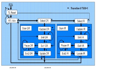 测试操作的最重要步骤是移入和同步移出测试数据(DR SHIFT),新的数据进入移位链,测试数据传送到测试单元(DR-update)的输出锁存器中,对于指令寄存器(IR-shift,IR-capture,IR-update)同样如此。除了边界扫描寄存器(Boundary Scan Register),IEEE 1149.1标准还定义了在数据寄存器附近至少存在一个旁路寄存器,用来将TDI 到TDO 的可以直连接。数据寄存器根据指令寄存器的指令寻址,然后在TDI 和TDO 的引脚之间,各个数据寄存器结合成移位路径。正如图2 所示,从一个状态转换成另一个状态由信号TMS 的逻辑电平决定。“TAP ”是一个时钟系统,它的时钟是由信号TCK 提供。信号TMS 和信号TCK共同作用,使得数据一位一位从TDI 移入,最后由TDO 移出。