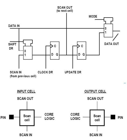 图3 就是一个最普通的边界扫描单元的结构图。第一个锁存器锁存数据由移位寄存器(SHIFT DR)决定从前一个扫描单元移出的数据(SCAN IN)或者是扫描输入的数据(DATA IN),并且由CLOCK DR控制锁存输出。在第一个锁存器移出数据稳定后,第二个锁存器由UPDATE DR 控制锁存输出第一个锁存器移出的数据。MODE 信号的电平决定是测试模式还是工作模式。边界扫描单元既有输入又有输出。一般来说,在每一个物理引脚不论输入还是输出,都有一个独立的边界扫描单元,但区别是输入在每一个物理引脚的后面,而对于所有的输出是在每一个物理引脚的前面。